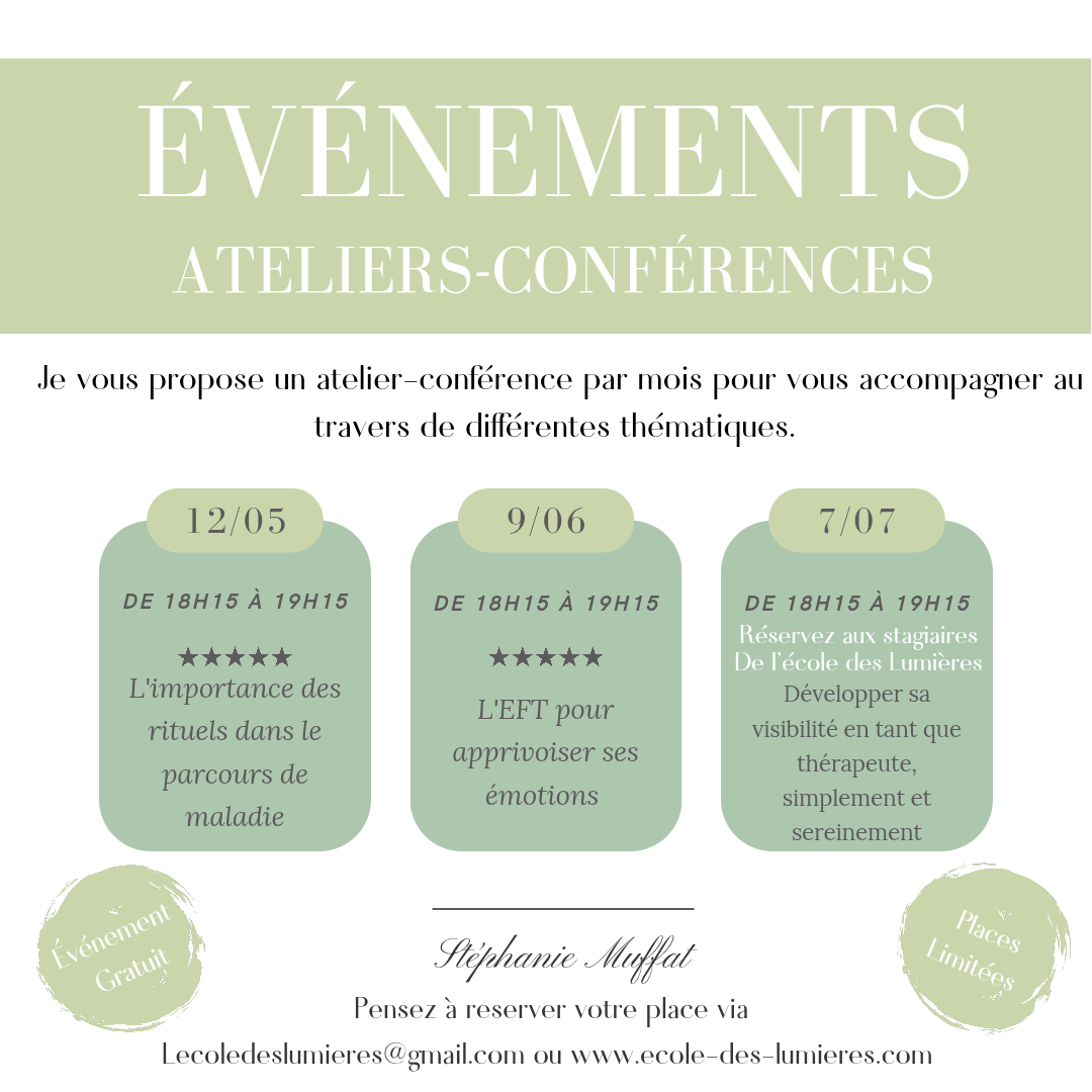 - mardi 7 juillet : "Développer sa visibilité en tant que thérapeute sereinement et simplement" (atelier réservé aux stagiaires de l'école des lumières)